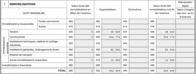 La première colonne représente les immobilisations déjà comptabilisées l'année fiscale précédente (normale si vide lors du premier exercice LMNP). La colonne « Augmentations » représente les immobilisations acquises sur cette année fiscale. La colonne « Valeur brute des immobilisations à la fin de l'exercice » est la somme des investissements au 31 décembre.