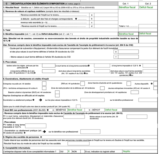 La liasse fiscale est remplie automatiquement à l'aide des informations saisies dans l'application Nopillo. Elle est télétransmise à l'administration fiscale et comporte les formulaires suivants.