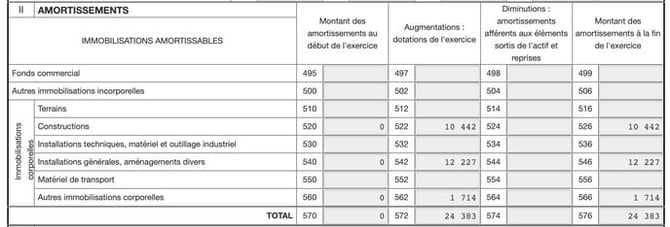La première colonne représente les amortissements déjà comptabilisés l'année précédente. La colonne « Augmentations : dotations de l'exercice » représente les amortissements constatés sur cette année fiscale. La colonne « Montant des amortissements à la fin de l'exercice » est la somme des amortissements pratiqués depuis le début de l'activité.