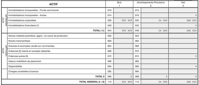 - Ligne « Terrains » (cases 420 à 426) : partie non amortissable selon les normes fiscales.