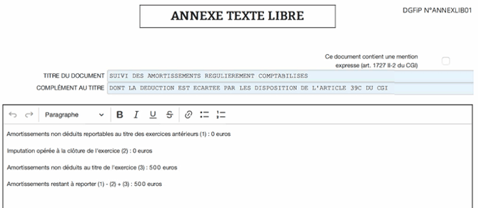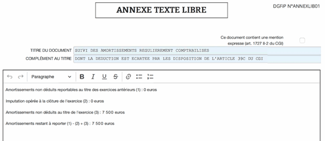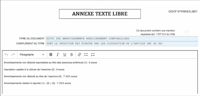 - Les 7 500 € d'amortissements reportables sont reportés sur l'annexe fiscale.