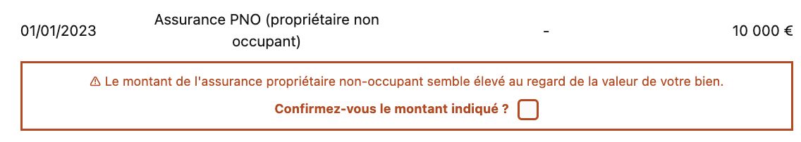 Ce message se déclenche automatiquement lorsque le montant de l'assurance PNO est supérieur à 0,3% de la valeur du bien. Cette valeur est arbitraire car le montant de l'assurance PNO dépend de nombreux critères (surface, ville...)