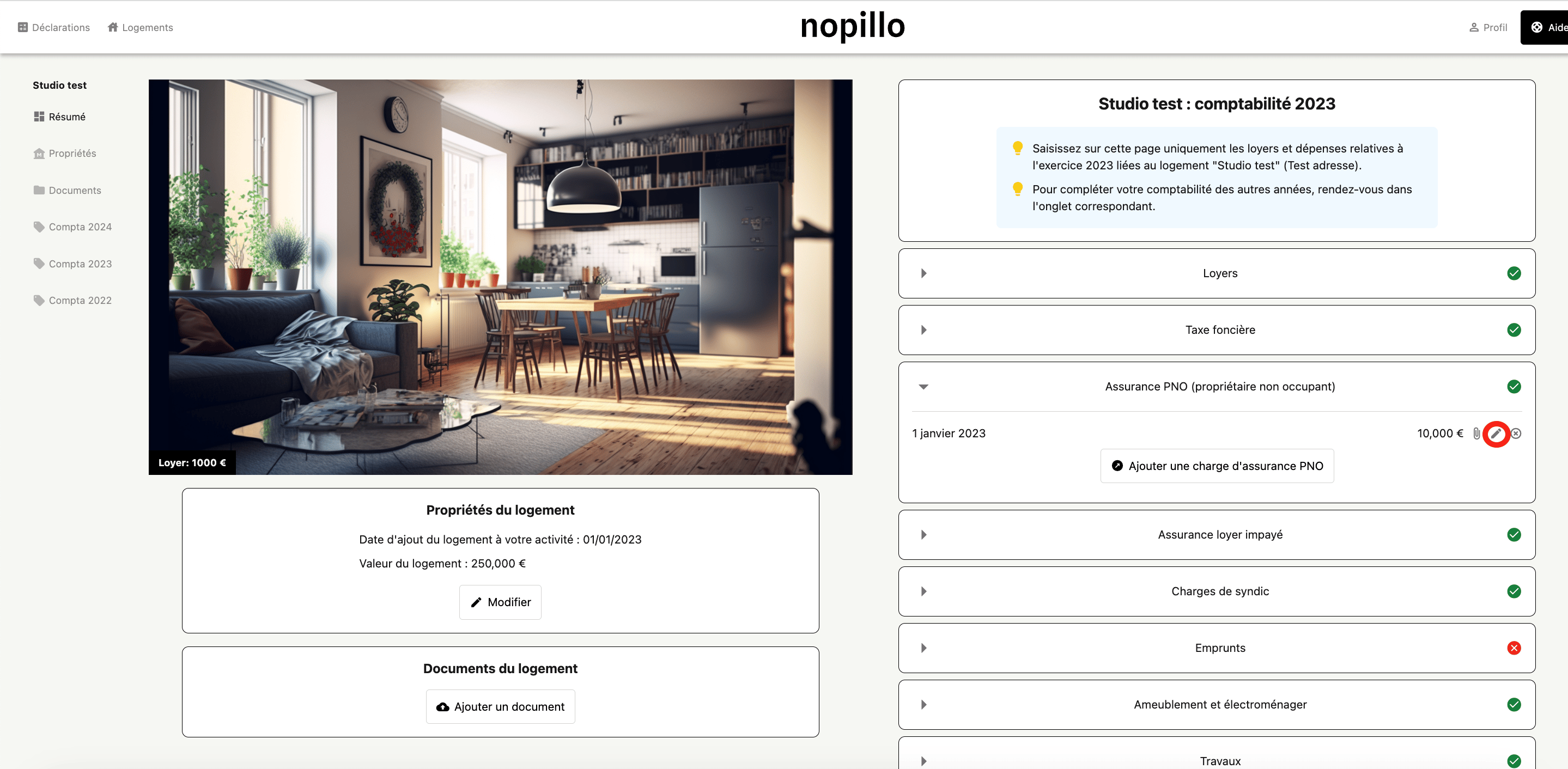 • Retournez sur votre espace Nopillo -> Catégorie ''Assurance PNO'' ->  Cliquez sur le petit stylo entouré en rouge :