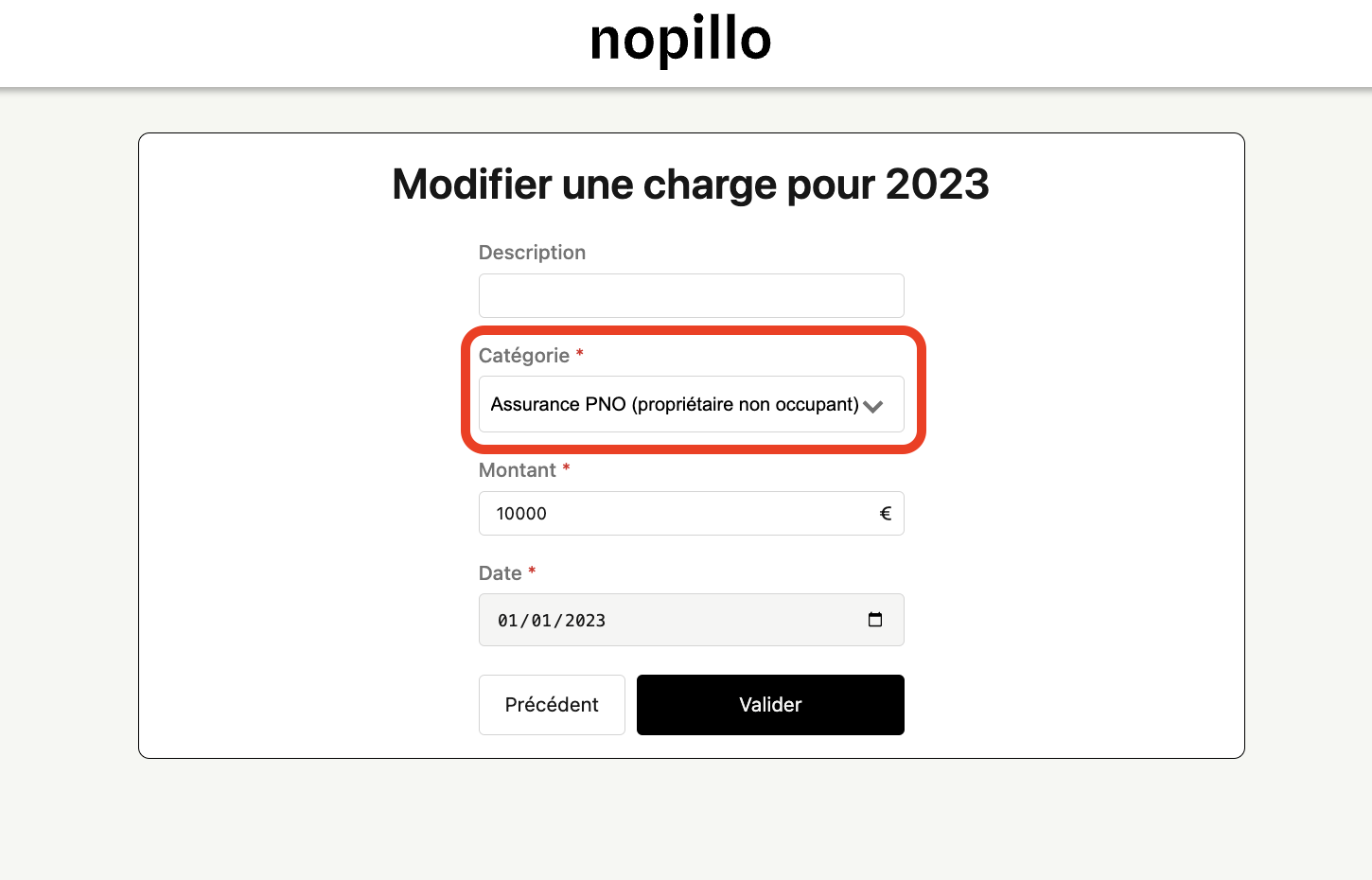 • Modifiez la valeur de votre assurance PNO par la valeur correcte et validez