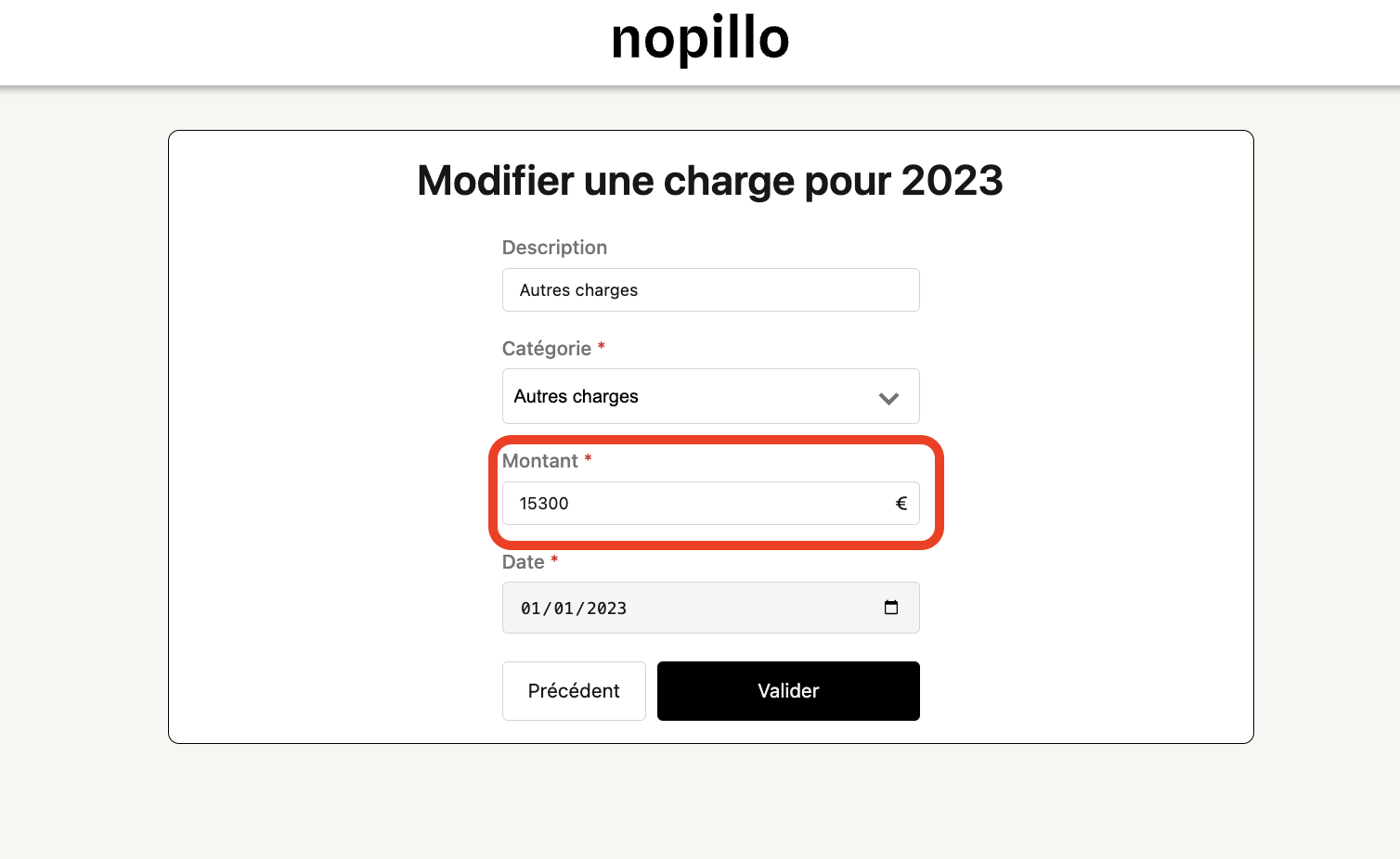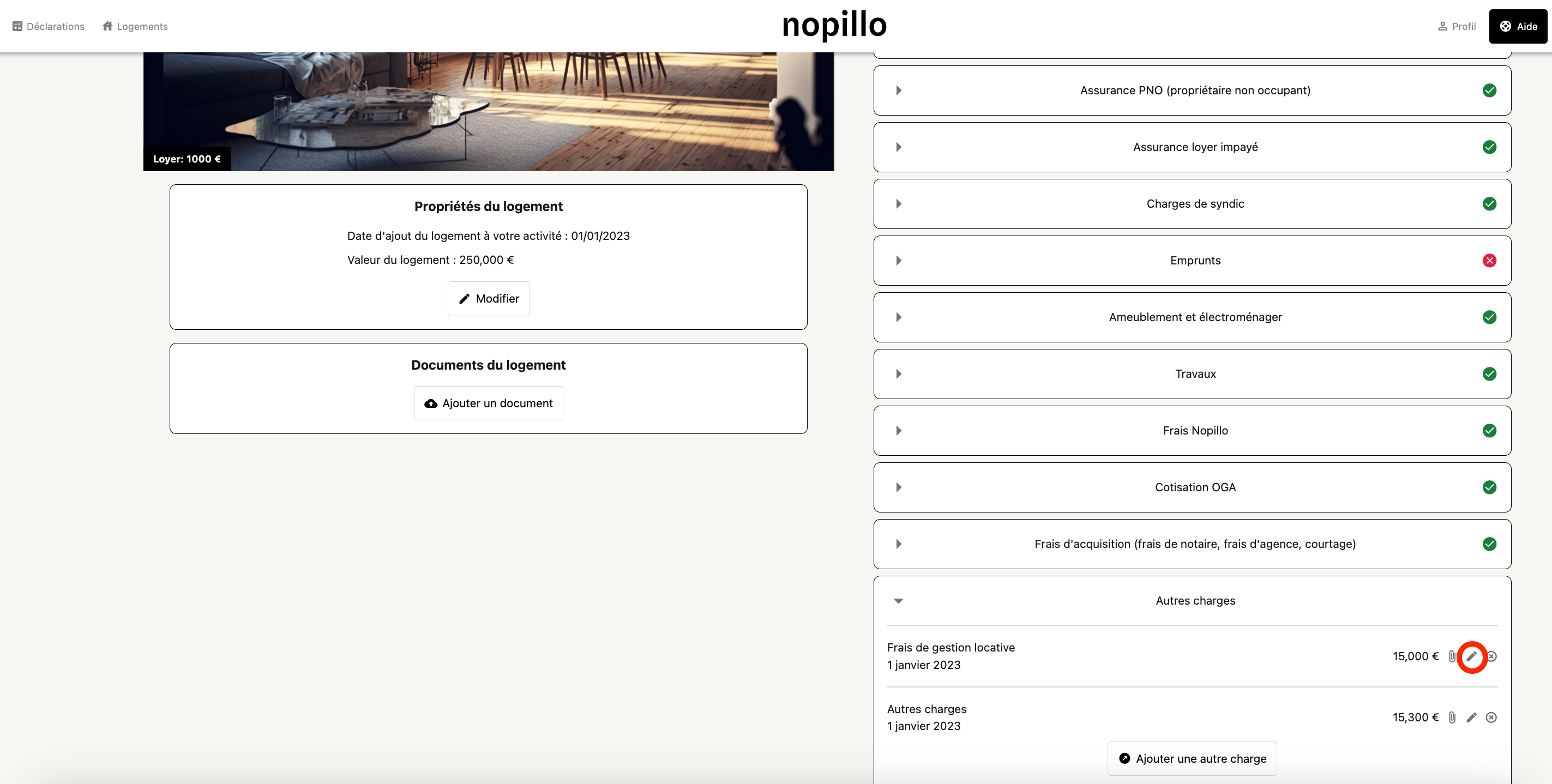 - Retournez sur votre espace Nopillo -> Catégorie ''Autres charges'' -> ''Frais de gestion locative'' Cliquez sur le petit stylo entouré en rouge :