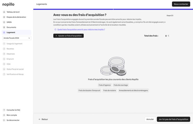 Dans cette dernière étape, vous pouvez ajouter, si vous en avez, les frais engagés lors de l’acquisition de votre logement. Voici les principales catégories à renseigner :