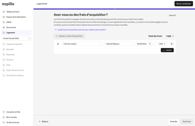 💡Recommandation Nopillo : pour simplifier votre comptabilité, il est conseillé d’ajouter ces frais dans la section "Logement". Ils seront alors automatiquement traités comme des amortissements.