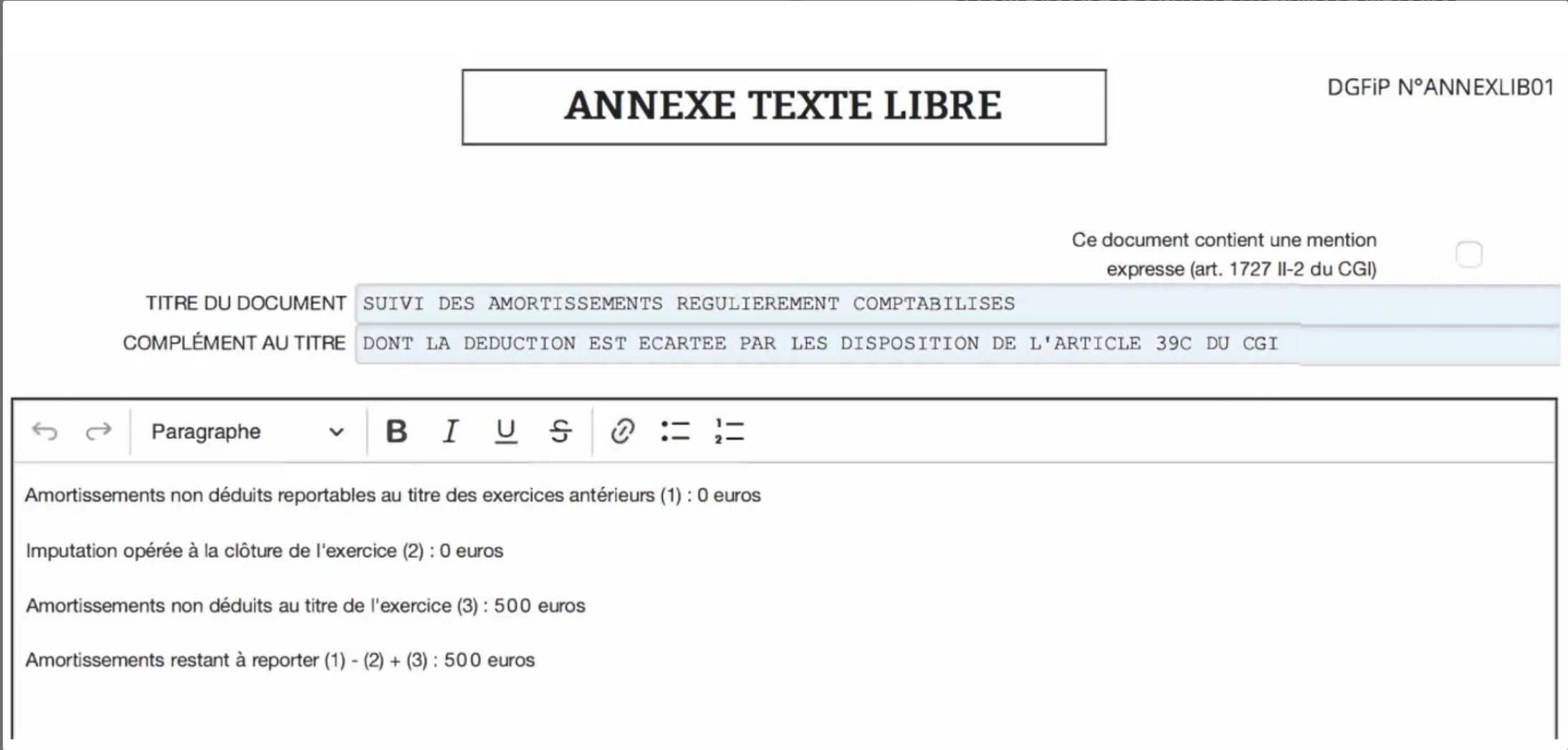 • Amortissements reportables (2) = 500€.