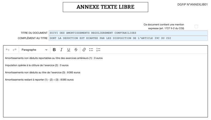 Conséquence : si votre amortissement calculé dépasse cette limite, la partie excédentaire n'est pas déductible immédiatement. C'est cette partie non déductible qui est mentionnée dans cette ligne.