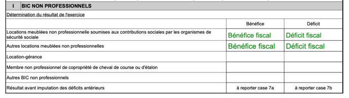 La section suivante comporte le bĂ©nĂ©fice (si rĂ©sultat positif) ou le dĂ©ficit (si rĂ©sultat nĂ©gatif) de votre activitĂ© LMNP/LMP. Ce mĂȘme montant est reportĂ© Ă plusieurs endroits du formulaire.