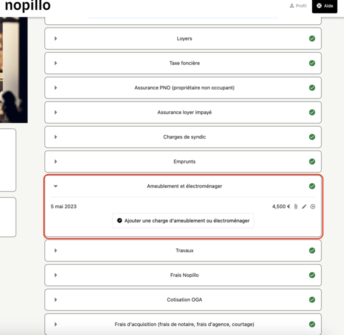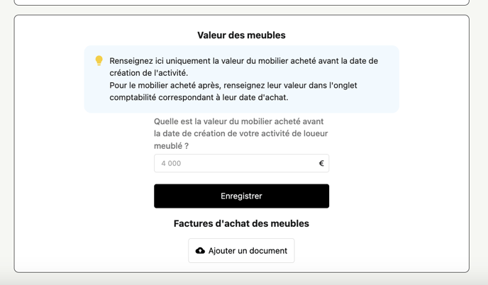 Il y a d'une part, la valeur du mobilier déclaré (cf capture d'écran ci-dessous) qui correspond au mobilier déjà présent dans le bien avant sa date d'achat. (onglet ''Propriétés'' en haut à gauche de votre espace)