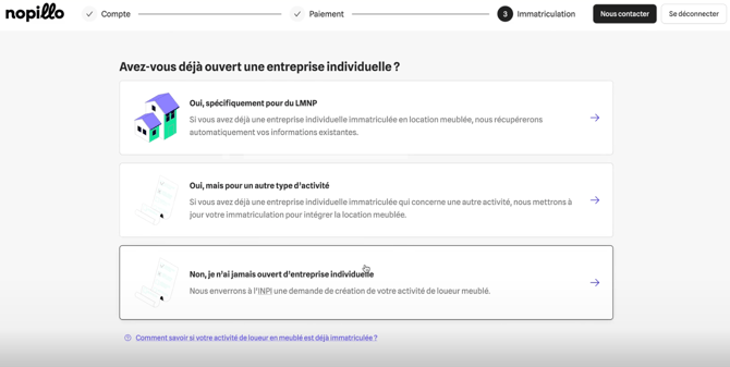 Sur l’interface d’immatriculation, sur la page “Avez-vous déjà ouvert une entreprise individuelle ?” sélectionnez “Oui, spécifiquement pour du LMNP” (si vous étiez, par le passé, immatriculé⸱e en LMNP).