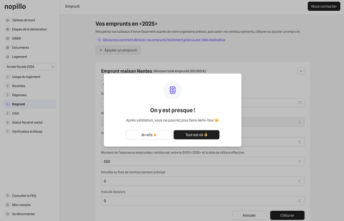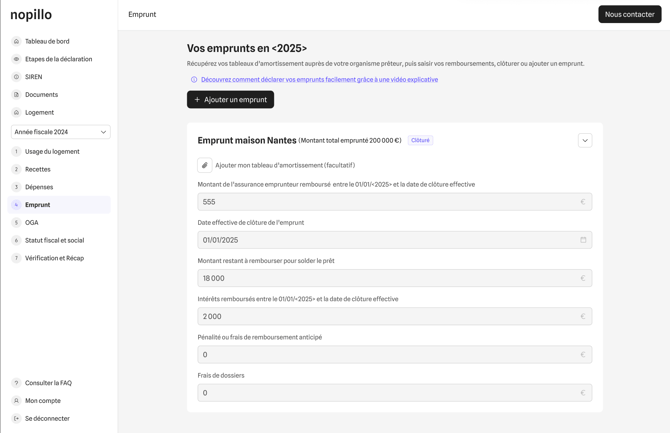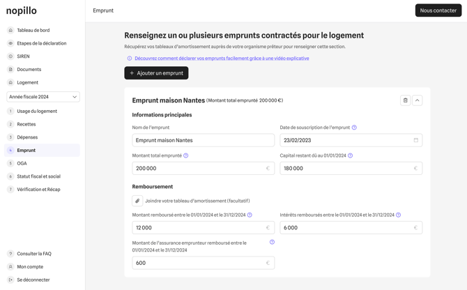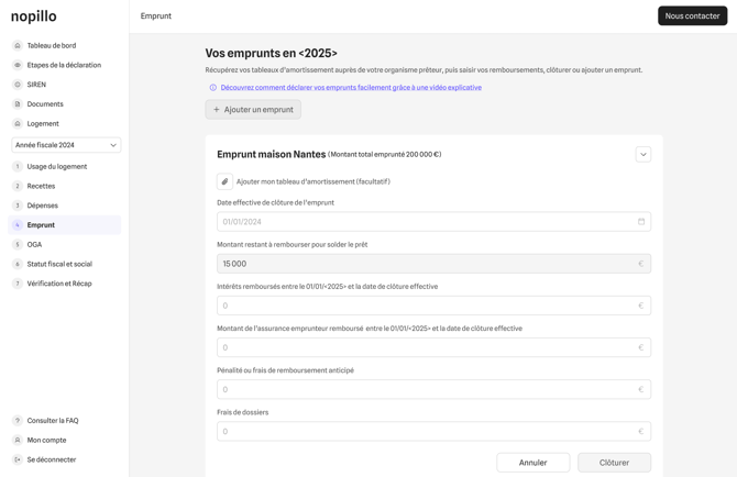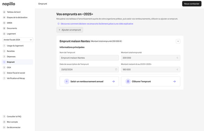 Déclarez votre emprunt immobilier sur Nopillo pour déduire vos intérêts et assurance emprunteur. Guide complet : saisie, modification, clôture et cas particuliers.